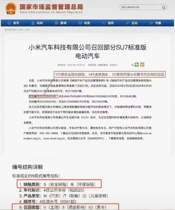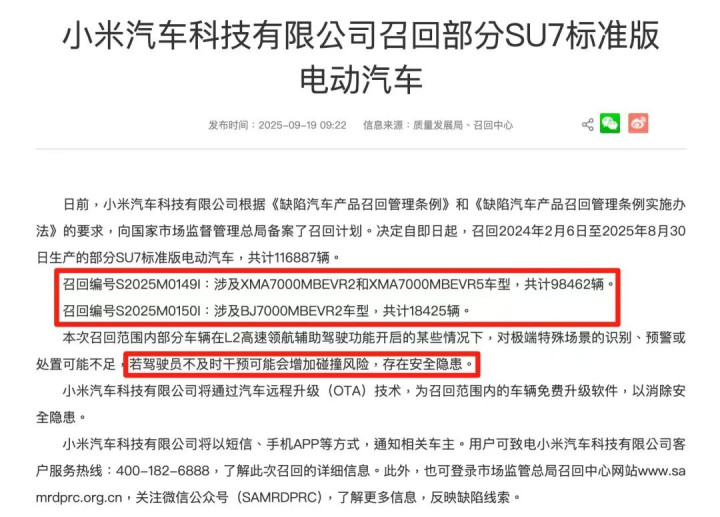 公告中提到,自9月19日起,小米汽车要根据相关要求召回自2024年2月6日至2025年8月30日生产的部分小米SU7标准版汽车。此次召回的规模,超过了11.68万辆。