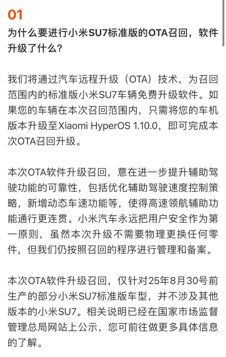 9月19日,也就是召回公告发布当天,小米汽车也发布了一则《小米汽车答车友问(第191集)》。其中首先就提到,小米汽车将通过OTA技术为召回范围内的标准版小米SU7车辆免费升级软件。