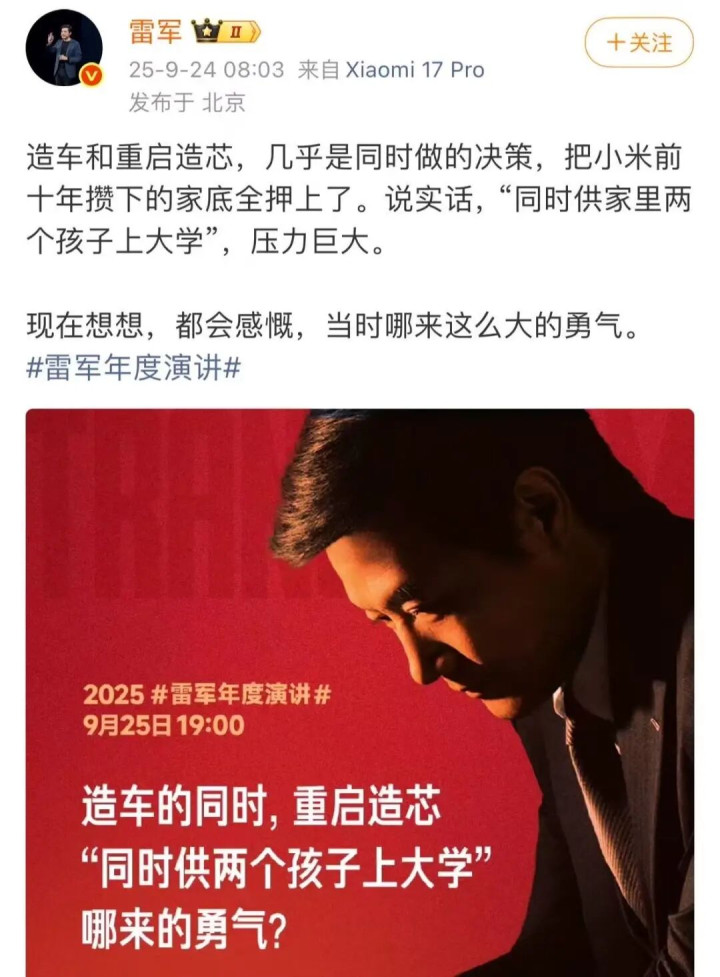 尽管如此,雷军的微博却仿佛并没有太多地受到召回事件的负面影响。除了常规的宣发博文,9月24日,雷军还为自己的年度个人演讲预热:“造车和重启造芯,几乎是同时做的决策……当时哪来这么大的勇气。”